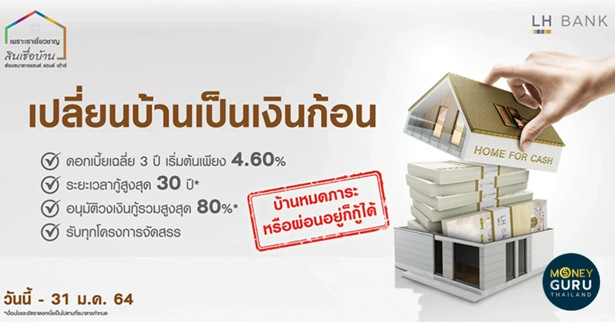 เปลี่ยนบ้านเป็นเงินก้อน ไม่ว่าจะเป็นบ้านหมดภาระ หรือผ่อนอยู่ก็กู้ได้ เฉลี่ย 3 ปีแรก เริ่มต้นเพียง 4.60% ต่อปี จาก LH BANK