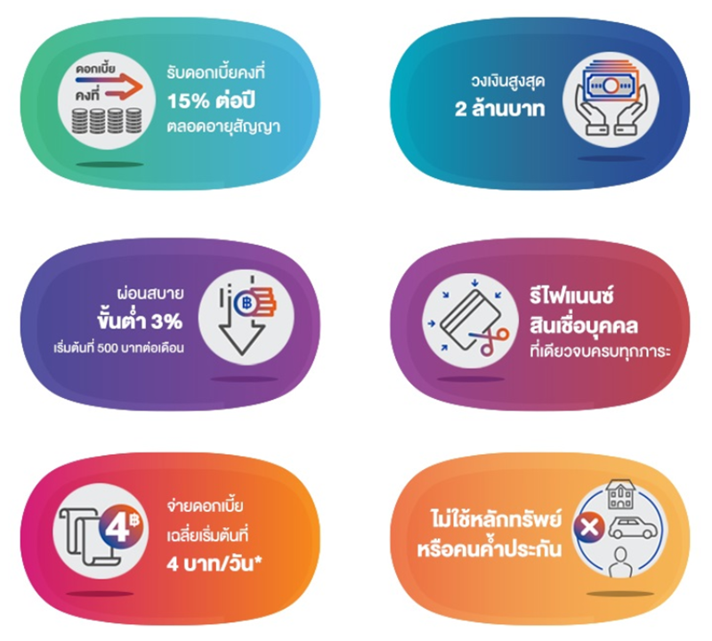 - ไม่ต้องใช้หลักทรัพย์หรือบุคคลค้ำประกัน วงเงินสำรองยามฉุกเฉิน ให้คุณวางแผนการใช้เงินได้อย่างอิสระ
