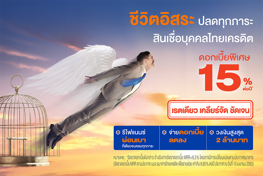 ชีวิตอิสระ ปลดทุกภาระ สินเชื่อบุคคลไทยเครดิต ดอกเบี้ยพิเศษ 15% ต่อปี เรตเดียว เคลียร์จัด ชัดเจน