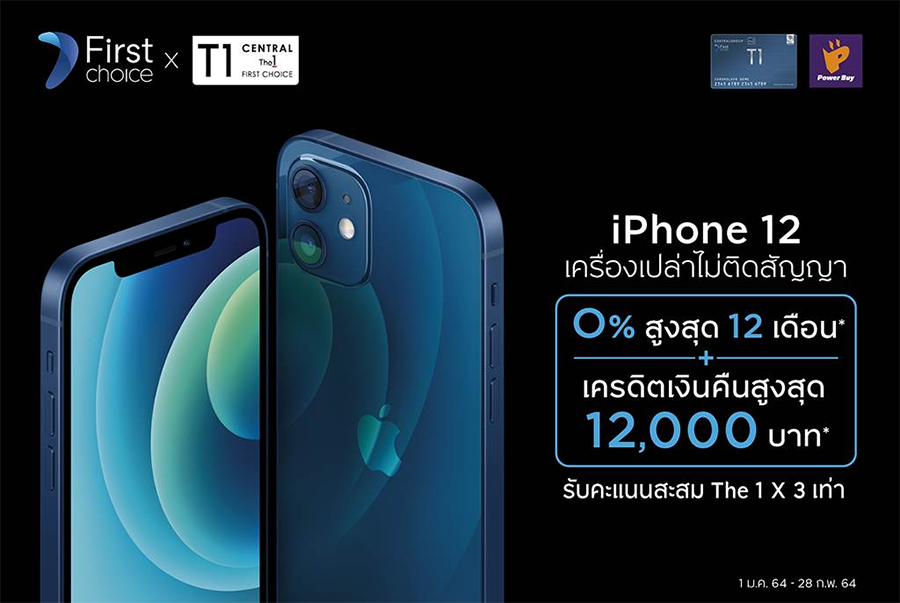 ผ่อน iPhone 12 ทุกรุ่น ทุกความจุ เครื่องเปล่าไม่ติดสัญญา 0% นาน 12 เดือน พร้อมรับเครดิตเงินคืนสูง กับบัตรเซ็นทรัล เดอะวัน เฟิร์สช้อยส์