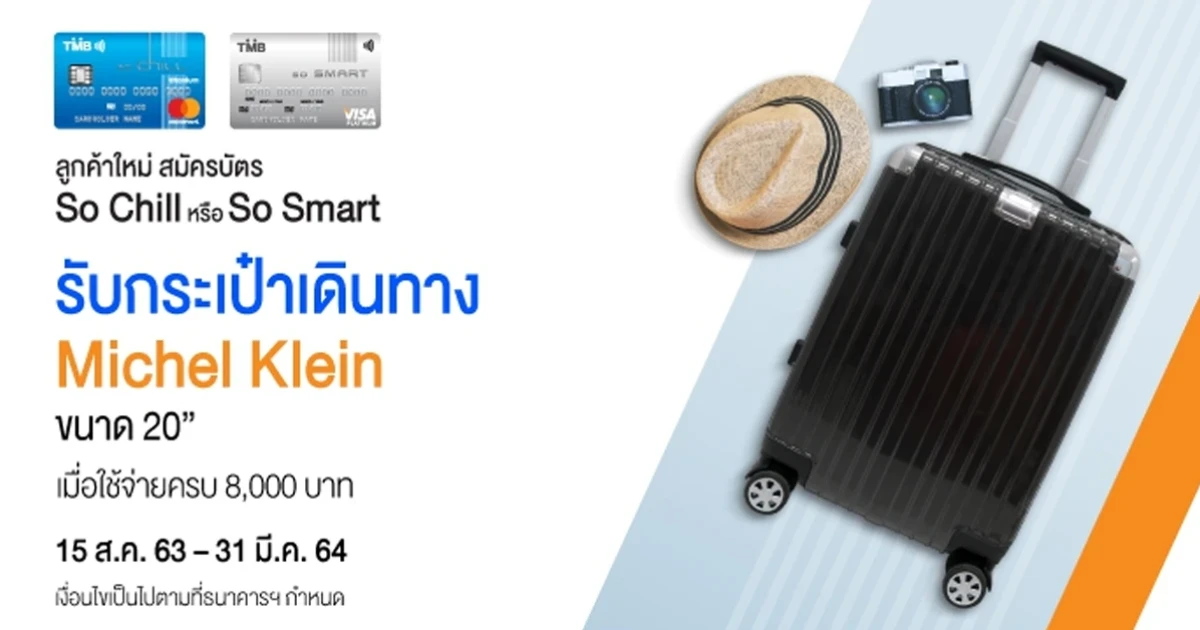 โปรโมชั่นพิเศษ...รับกระเป๋าเดินทาง Michel Klein ขนาด 20" มูลค่า 4,250 บาทสำหรับผู้สมัครบัตรเครดิต ทีเอ็มบี โซ สมาร์ท (TMB So Smart Credit card) หรือ บัตรเครดิต ทีเอ็มบี โซ ชิลล์ (TMB So Chill Credit Card) ประเภทบัตรหลักใบแรก และยังไม่เคยมีบัตรเครดิต TMB ทุกประเภทมาก่อน หรือเคยมี แต่ยกเลิกไปแล้วไม่น้อยกว่า 6 เดือน นับตั้งแต่วันที่บัตรใหม่ได้รับการอนุมัติ และเมื่อมียอดใช้จ่ายผ่านบัตรครบ 8,000 บาท ภายใน 60 วัน นับจากวันที่บัตรได้รับการอนุมัติฯ