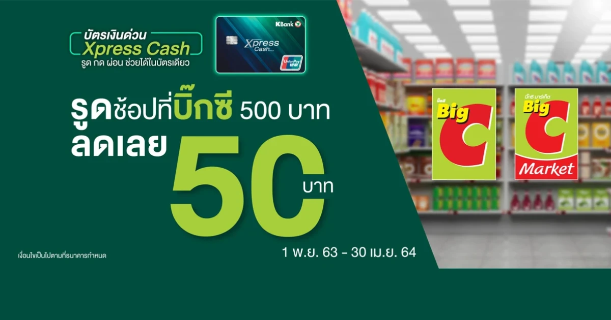 2. ลูกค้าจะได้รับส่วนลด 50 บาท เมื่อนำบัตรเงินด่วน Xpress Cash ชำระค่าสินค้า อย่างน้อย 500 บาทต่อรายการที่บิ๊กซี ซูเปอร์เซ็นเตอร์ และ บิ๊กซี มาร์เก็ตทุกสาขา