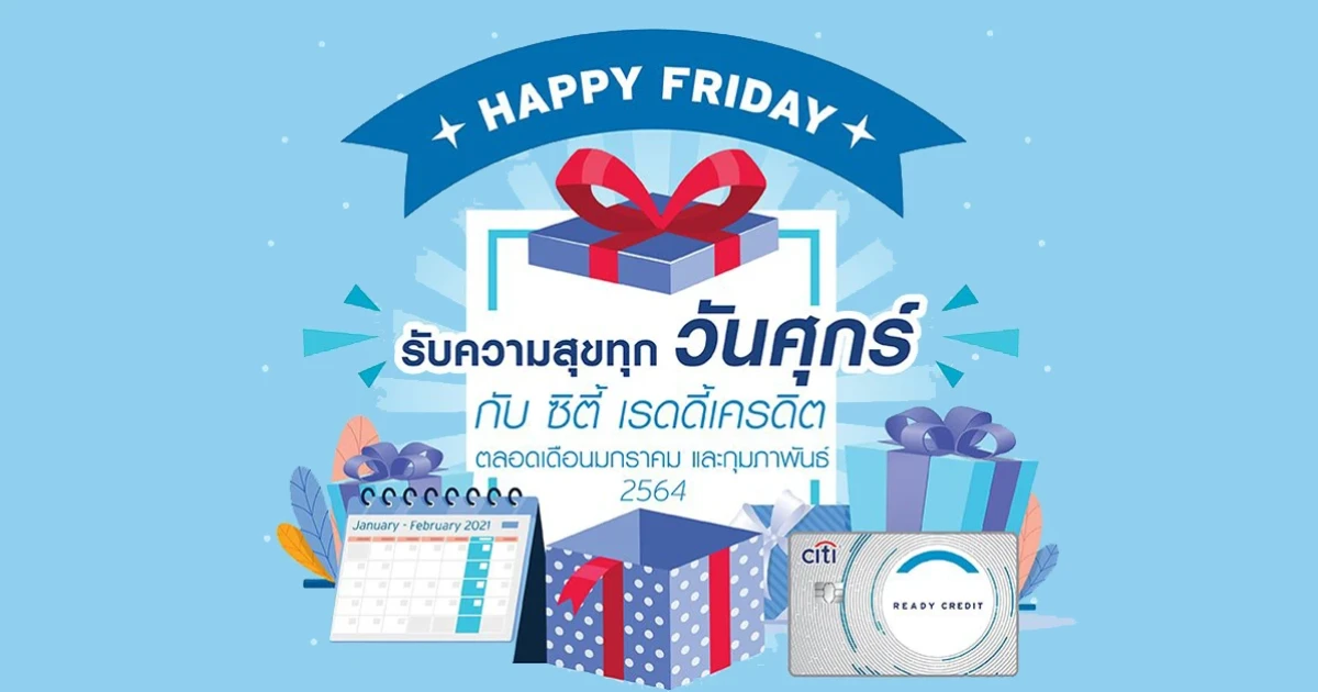 HAPPY FRIDAY รับความสุขทุก วันศุกร์ กับ บัตรกดเงินสดซิตี้ เรดดี้เครดิต ตลอดเดือนมกราคม และกุมภาพันธ์ 2564 รับเครดิตเงินคืนมูลค่าสูงสุด 3,200 บาท เมื่อมียอดกดเงินสดและยอดคงค้างในบัญชีฯ ตั้งแต่ 30,000 บาทขึ้นไป