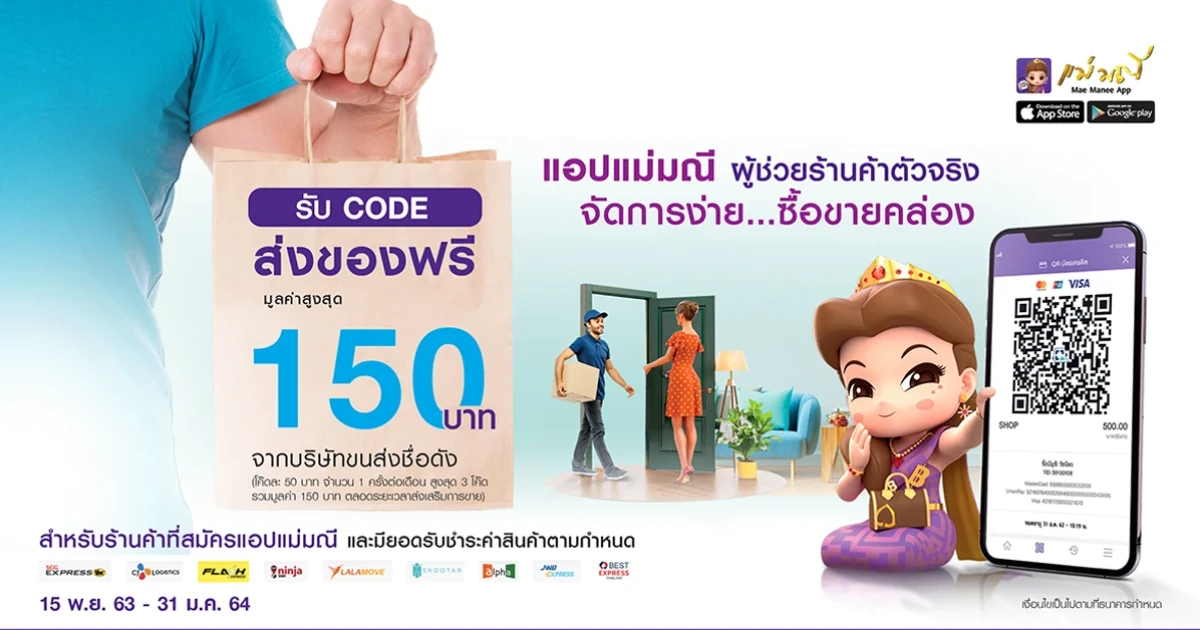 สิทธิพิเศษ สำหรับร้านค้า : รับโค้ดส่งของฟรี 50 บาท รวมสูงสุด 150 บาท เมื่อสมัครแอปพลิเคชัน แม่มณี และรับชำระค่าสินค้า หรือบริการผ่านแอปพลิเคชันแม่มณี