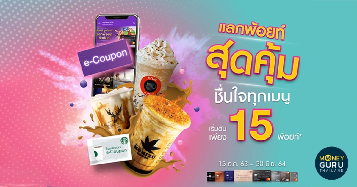 บัตรเครดิต SCB ใช้พ้อยท์แลกน้อย...อร่อยเวอร์ เพียงใช้คะแนนสะสม SCB rewareds แลกรับ e-Coupon ผ่านแอป SCB เริ่มต้น 15 คะแนน