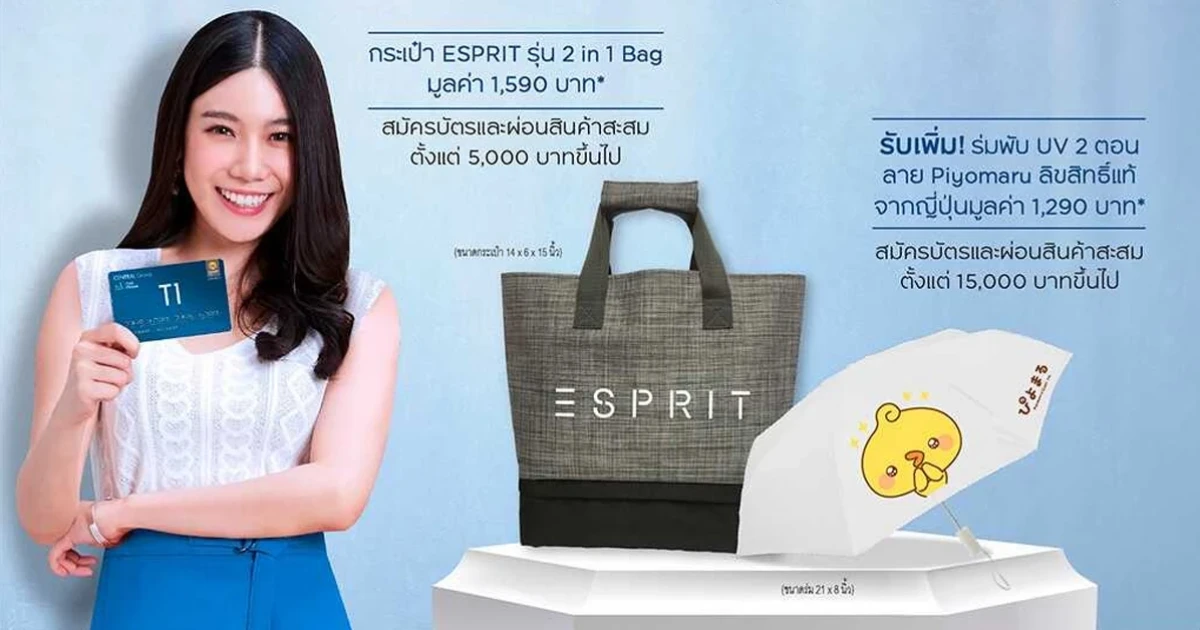 - รับกระเป๋า ESPRIT รุ่น 2 in 1 Bag จำนวน 1 ใบ มูลค่า 1,590 บาท เมื่อมียอดผ่อนสินค้าสะสม ตั้งแต่ 5,000 บาทขึ้นไป ผ่านบัตรฯ ณ ร้านค้าในเครือ เซ็นทรัล กรุ๊ป ที่ร่วมรายการ ภายใน 30 วันนับจากวันที่ได้รับการอนุมัติ (30วัน ไม่รวมวันอนุมัติ) (ไม่รวมการกดเงินสด) และ