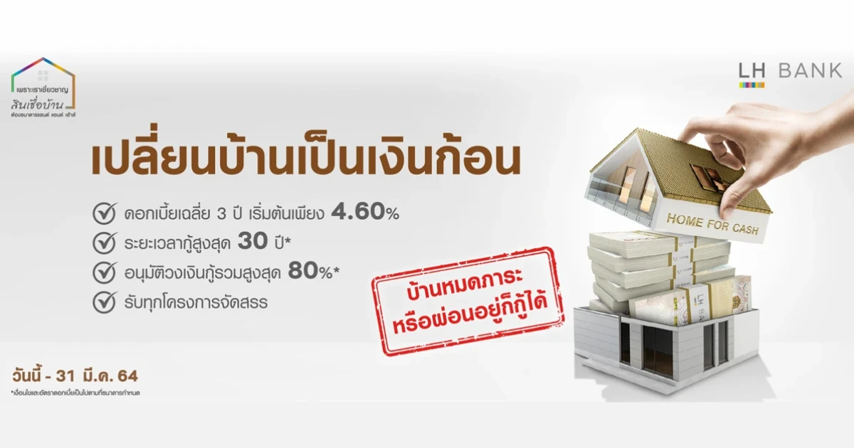 เปลี่ยนบ้านเป็นเงินก้อน ดอกเบี้ยเริ่มต้นเพียง 4.60% 3 ปีแรก กับสินเชื่อบ้านเพิ่มเงิน LH Bank