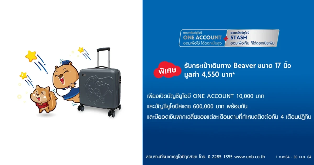 - เปิดบัญชียูโอบี ONE ACCOUNT ขั้นต่ำ 10,000 บาท และบัญชียูโอบีสแตช ขั้นต่ำ 600,000 บาท พร้อมกัน ระหว่างวันที่ 1 ก.พ. 64 - 30 เม.ย. 64 และมียอดเงินฝากเฉลี่ยของแต่ละเดือนไม่น้อยกว่า 10,000 บาท สำหรับบัญชียูโอบี ONE ACCOUNT และ 600,000 บาท สำหรับบัญชียูโอบีสแตช ติดต่อกัน 4 เดือนปฏิทิน โดยเริ่มนับเดือนที่เปิดบัญชีเป็นเดือนแรก ลูกค้าจะได้รับกระเป๋าเดินทาง Beaver ขนาด 17 นิ้ว จำนวน 1 ใบ มูลค่า 4,550 บาท