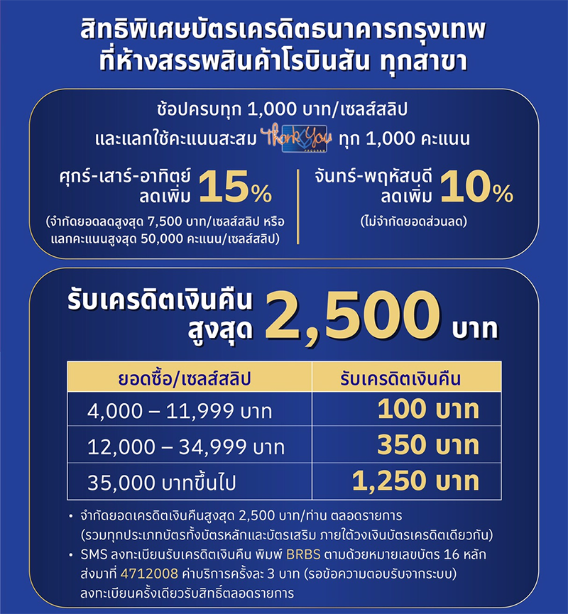 - สิทธิพิเศษสำหรับผู้ถือบัตรเครดิตธนาคารกรุงเทพที่มียอดใช้จ่ายผ่านบัตร เฉพาะชำระเติมจำนวน (ไม่รวมรายการแบ่งชำระ) ระหว่างวันที่ 29 ม.ค. 64 - 21 ก.พ. 64 ที่ห้างสรรพสินค้าโรบินสัน ทุกสาขา ยกเว้นการซื้อสินค้าที่ร้านค้า เพาเวอร์บาย, ซูเปอร์สปอร์ต, เซ็นทรัล ฟู้ด ฮอลล์, ท็อปส์ มาร์เก็ต, บีทูเอส, โฮมเวิร์ค, มูจิ, การซื้อบัตรของขวัญและสินค้าแลกซื้อ, ร้านค้าเช่าทั้งในห้างฯ และศูนย์การค้า