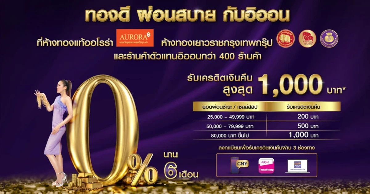 ทองดี ผ่อนสบาย กับอิออน 0% 6 เดือน พร้อมรับเครดิตเงินคืนสูงสุด 1,000 บาท
