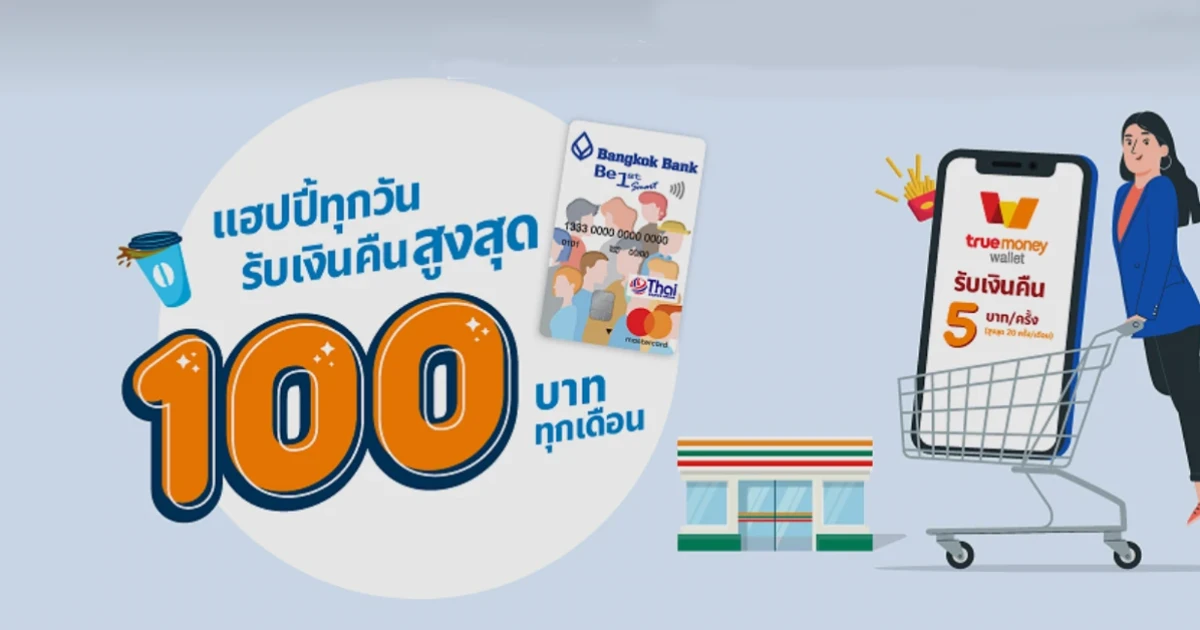 แฮปปี้ทุกวัน รับเงินคืนสูงสุด 100 บาททุกเดือน...เมื่อจ่ายด้วยบัตรบีเฟิสต์ สมาร์ท ทีพีเอ็น มาสเตอร์การ์ด ผ่าน True Money Wallet รับเงินคืน 5 บาท/ครั้ง (สูงสุด 20 ครั้ง/เดือน) ตั้งแต่ 15 ก.พ. 64 - 15 ส.ค. 64