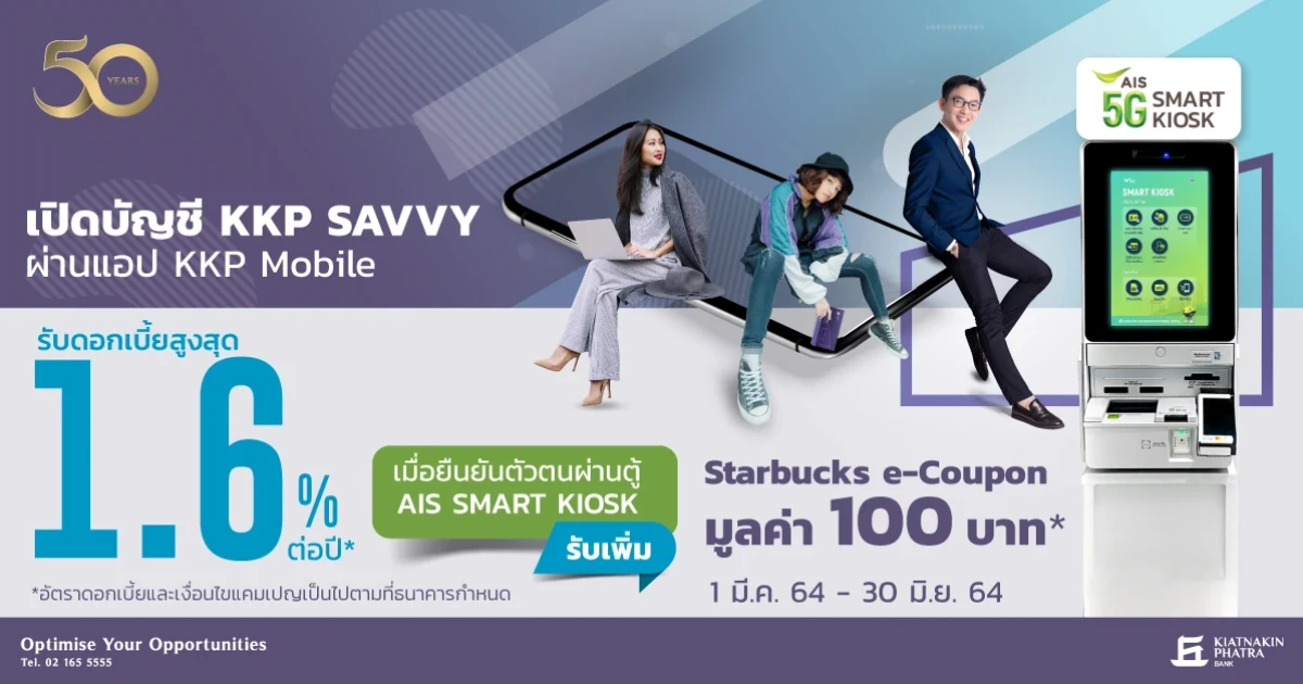 พิเศษ! สำหรับลูกค้าที่เปิดบัญชีเงินฝากออมทรัพย์ออนไลน์ KKP Savvy ผ่านแอป KKP Mobile Application และทำการยืนยันตัวตนผ่านตู้ AIS Smart Kiosk รับเพิ่ม Starbucks e- Coupon มูลค่า 100 บาท*