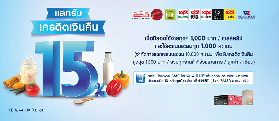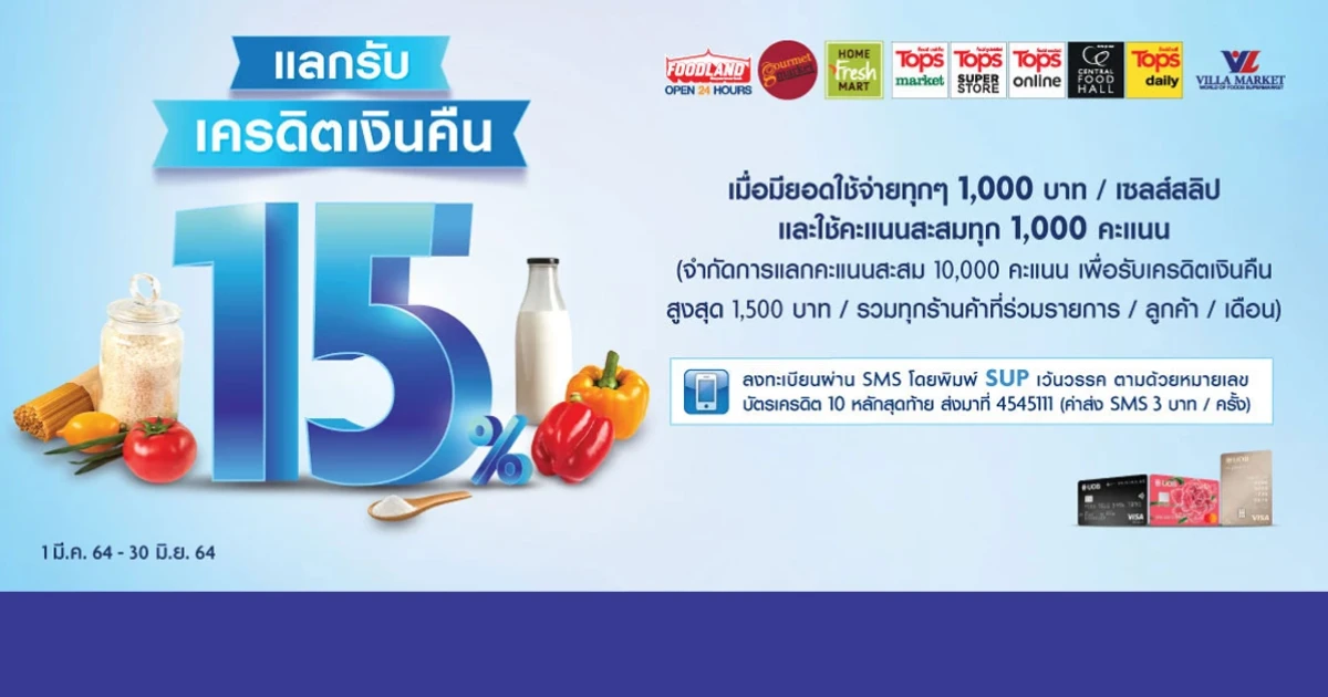สิทธิพิเศษสำหรับลูกค้าบัตรเครดิตยูโอบี แลกรับเครดิตเงินคืน 15% เมื่อมียอดใช้จ่ายผ่านบัตรเครดิตยูโอบี ทุก ๆ 1,000 บาท/เซลส์สลิป ที่ ฟู้ดแลนด์, วิลล่า มาร์เก็ต, กูร์เมต์ มาร์เก็ต, โฮมเฟรชมาร์ท และ ท็อปส์ ซุปเปอร์มาร์เก็ต (ท็อปส์ ซูเปอร์สโตร์, ท็อปส์ เดลี่, ท็อปส์ออนไลน์ และเซ็นทรัล ฟู้ด ฮอลล์) ทุกสาขา
