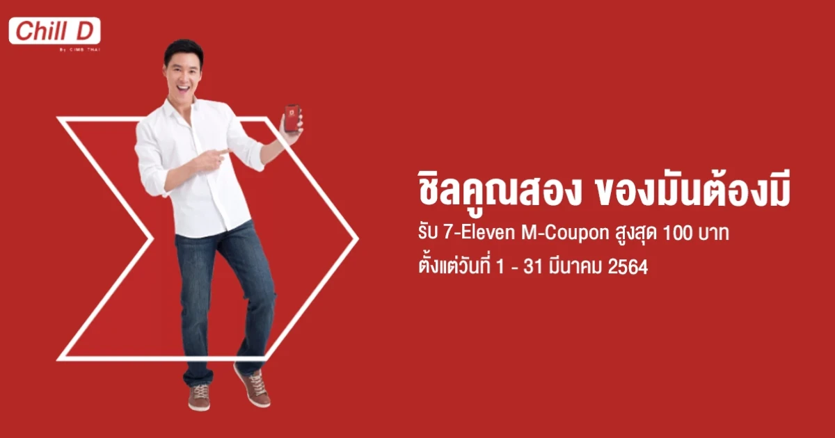 ชิลคูณสอง ของมันต้องมี รับ M-Coupon 7-Eleven มูลค่าสูงสุด 100 บาท เมื่อเปิดบัญชีเงินฝากออมทรัพย์ชิลดี ซีไอเอ็มบี ไทย และมียอดเงินขั้นต่ำ 500 บาท อยู่ในบัญชีเงินฝากออมทรัพย์ชิลดี ซีไอเอ็มบี ไทย