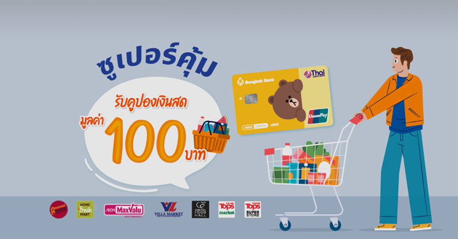 รับคูปองเงินสด 100 บาท เมื่อช้อปตั้งแต่ 1,000 บาทขึ้นไป/เซลส์สลิป ที่ Gourmet Market, Home Fresh Mart, Maxvalu, Villa Market, Central Food Hall, Tops Market และ Tops Superstore ผ่านบัตรบีเฟิสต์ สมาร์ท ทีพีเอ็น ยูเนี่ยนเพย์ ตั้งแต่ 15 ก.พ. 64 - 15 ส.ค. 64