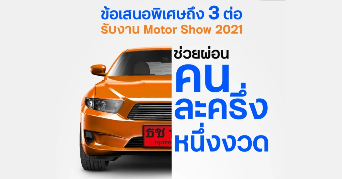 ข้อเสนอพิเศษถึง 3 ต่อ รับงาน Motor Show 2021 ช่วยผ่อนคนละครึ่งหนึ่งงวด ตั้งแต่วันที่ 22 มี.ค. - 9 เม.ย. 64 และเกิดสัญญาออกรถยนต์ภายในวันที่ 31 พ.ค. 64