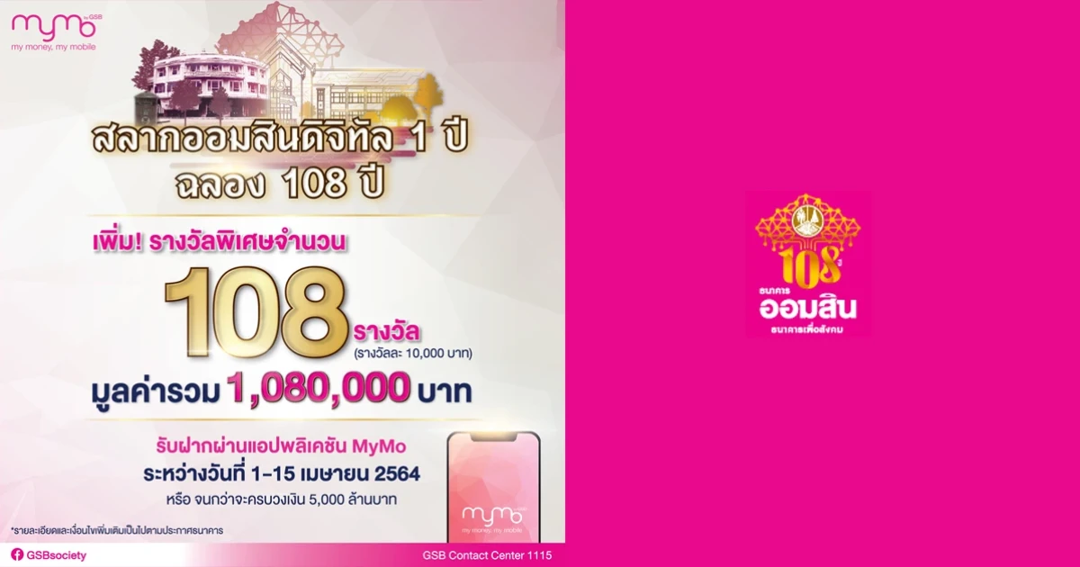 สลากออมสินดิจิทัล 1 ปี ฉลอง 108 ปี เพิ่มรางวัลพิเศษ 108 รางวัล (รางวัลละ 10,000 บาท) มูลค่ารวม 1,080,000 บาท โดยรบฝากผ่านแอปพลิเคชัน MyMo ระหว่างวันที่ 1 - 15 เมษายน 2564 หรือจนกว่าจะครบวงเงิน 5,000 ล้านบาท