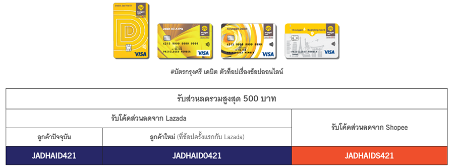 - กรณีเป็นลูกค้าปัจจุบันของ Lazada ผู้ถือบัตรกรุงศรี เดบิต และ Krungsri Boarding Card จะต้องใส่โค้ดส่วนลด JADHAID421 เพื่อรับส่วนลด 250 บาท เมื่อช้อปขั้นต่ำ 1,000 บาทต่อใบเสร็จ หลังหักค่าขนส่งและส่วนลดทุกประเภท (สามารถสะสมยอดการใช้ต่างร้านค้า) ระหว่างวันที่ 1 เมษายน 2564 - 30 เมษายน 2564 โดยโค้ดส่วนลดมีจำนวนจำกัด 1,000 สิทธิ์/เดือน ทั้งนี้ จำนวน 1,000 สิทธิ์ดังกล่าวจะแบ่งจำกัด 340 สิทธิ์, 330 สิทธิ์ และ 330 สิทธิ์/รอบ ดังนี้