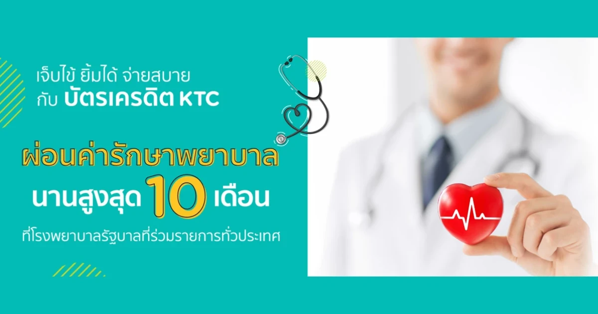 สิทธิพิเศษสำหรับสมาชิก บัตรเครดิต KTC เจ็บไข้ ยิ้มได้ จ่ายสบาย ผ่อนค่ารักษาพยาบาลที่โรงพยาบาลรัฐบาลทั่วประเทศ นานสูงสุด 10 เดือน เมื่อมียอดใช้จ่ายผ่านบัตรฯ ตั้งแต่ 3,000 บาทขึ้นไป
