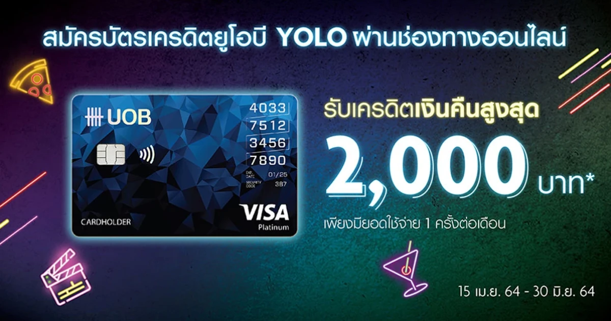 - โปรโมชั่นนี้ระหว่างวันที่ 15 เม.ย. 64 - 30 มิ.ย. 64 สำหรับลูกค้าใหม่ที่สมัครบัตรเครดิตยูโอบี โยโล่ แพลทินัม ผ่านช่องทางออนไลน์เท่านั้น และได้รับการอนุมัติบัตรเครดิตจากธนาคารภายในวันที่ 16 ก.ค. 64