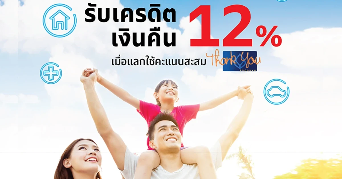รับเครดิตเงินคืน 12% เมื่อชำระเบี้ยประกัน ครบทุก 1,000 บาท/เซลส์สลิป และแลกใช้คะแนนสะสม Thank You ทุก 1,000 คะแนน (ไม่จำกัดยอดการรับเครดิตเงินคืน)