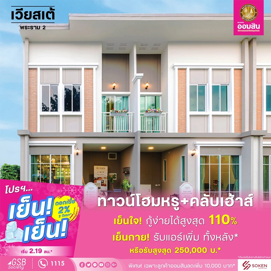 ทาวน์โฮมหรู+คลับเฮ้าส์ เย็นใจ! กู้ง่ายได้สูงสุด 110% เย็นกาย! รับแอร์เพิ่มทั้งหลัง เมื่อกู้กับธนาคารออมสิน