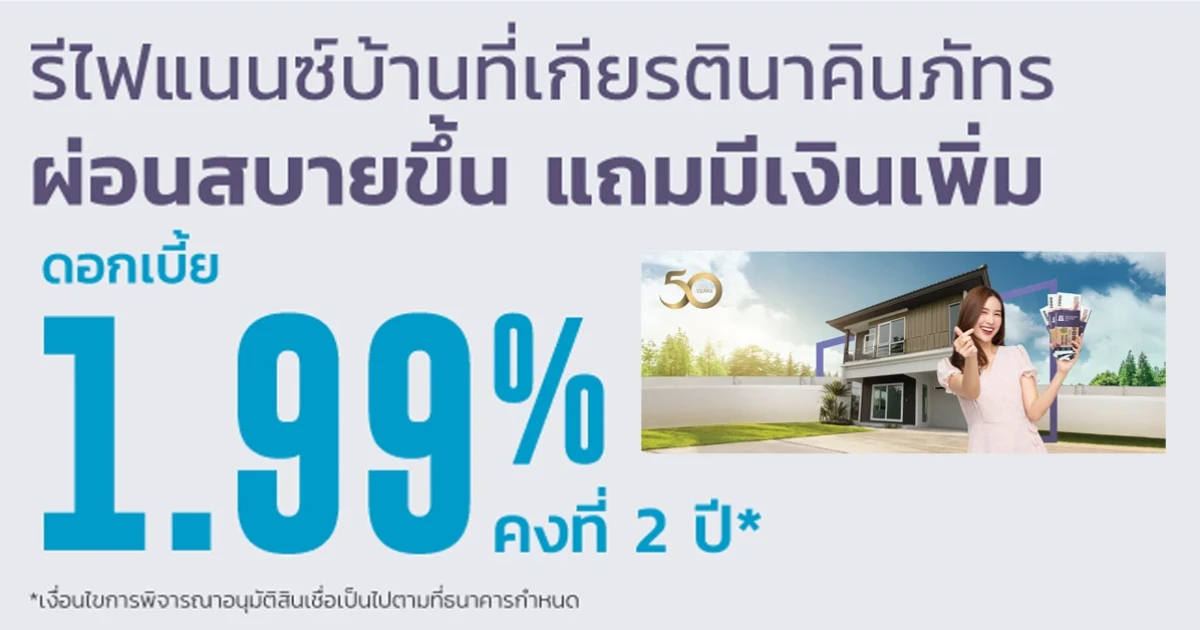 รีไฟแนนซ์บ้านที่เกียรตินาคินภัทร ผ่อนสบายขึ้น แถมมีเงินเพิ่ม ดอกเบี้ย 1.99% ต่อปี คงที่ 2 ปี
