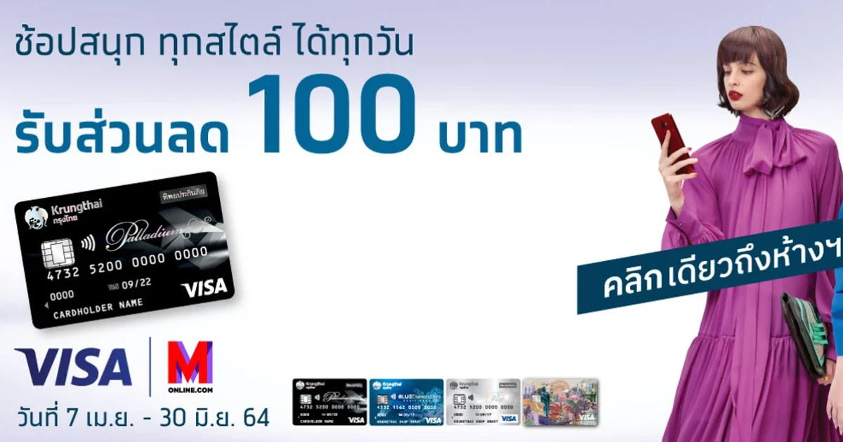 สิทธิพิเศษ ลูกค้่าบัตรเดบิตกรุงไทย วีซ่า และ Krungthai Travel Card เมื่อผูกบัตรฯ และช้อปครั้งแรกที่ www.monline.com ตั้งแต่ 1,000 บาทขึ้นไป รับส่วนลด 100 บาท