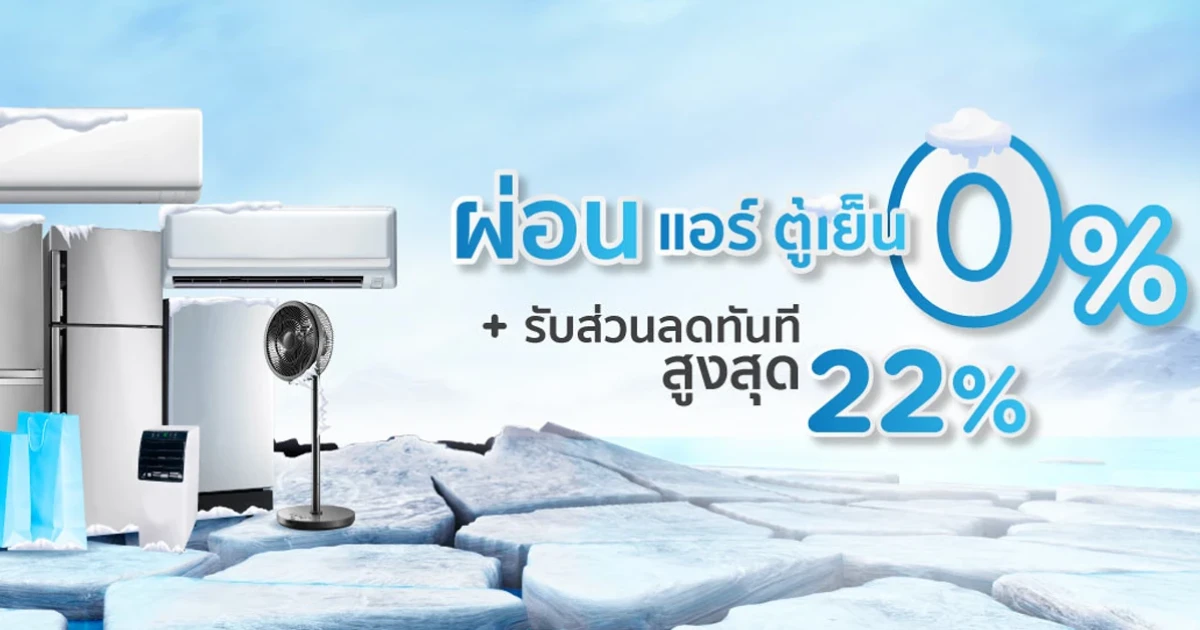 ผ่อนแอร์ ตู้เย็น 0% พร้อมรับส่วนลดทันที สูงสุด 22%