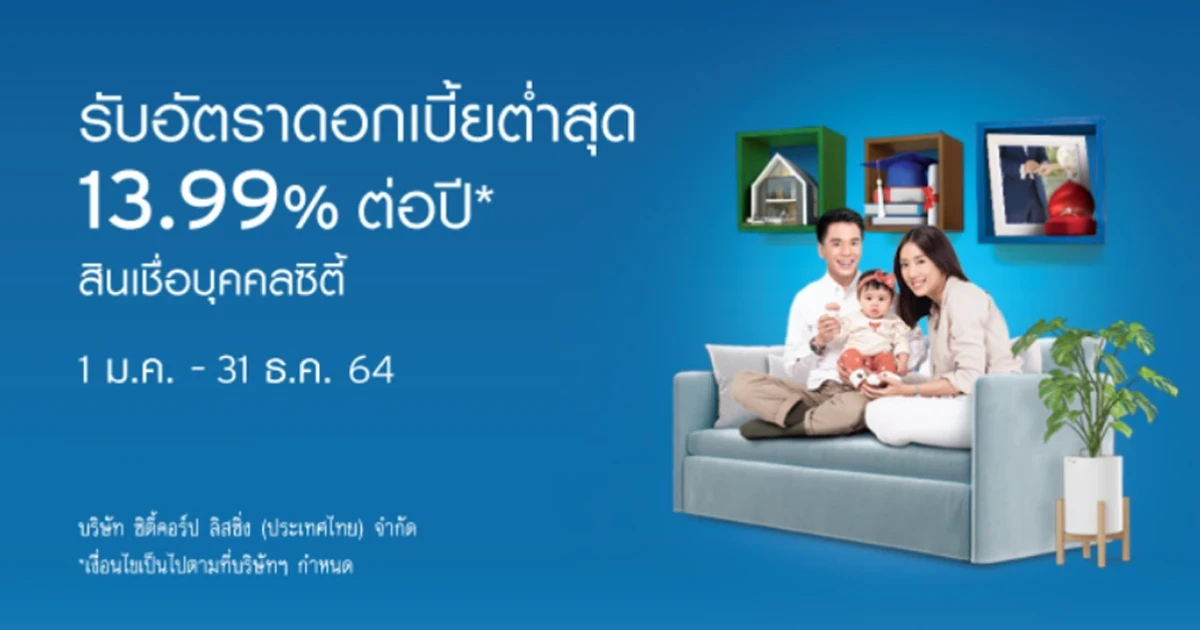 สินเชื่อบุคคลซิตี้ ดอกเบี้ยพิเศษต่ำสุด 13.99% ต่อปี ไม่ต้องใช้หลักทรัพย์หรือผู้ค้ำประกัน