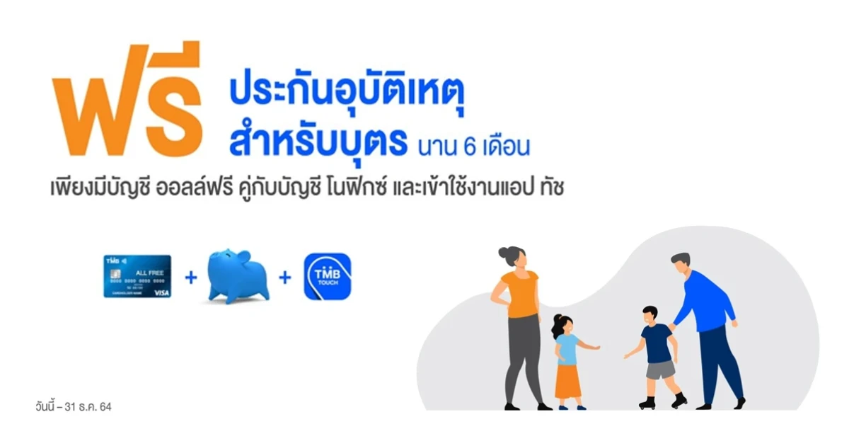 สิทธิพิเศษสำหรับลูกค้าธนาคารทหารไทยธนชาต รับฟรี ประกันอุบัติเหตุสำหรับบุตร นาน 6 เดือน เพียงมีบัญชีเพื่อใช้ บัญชีทีทีบี ออลล์ ฟรี คู่กับ บัญชีเพื่อออม บัญชี ทีทีบี โน ฟิกซ์ และเข้าใช้งานแอป ทัช