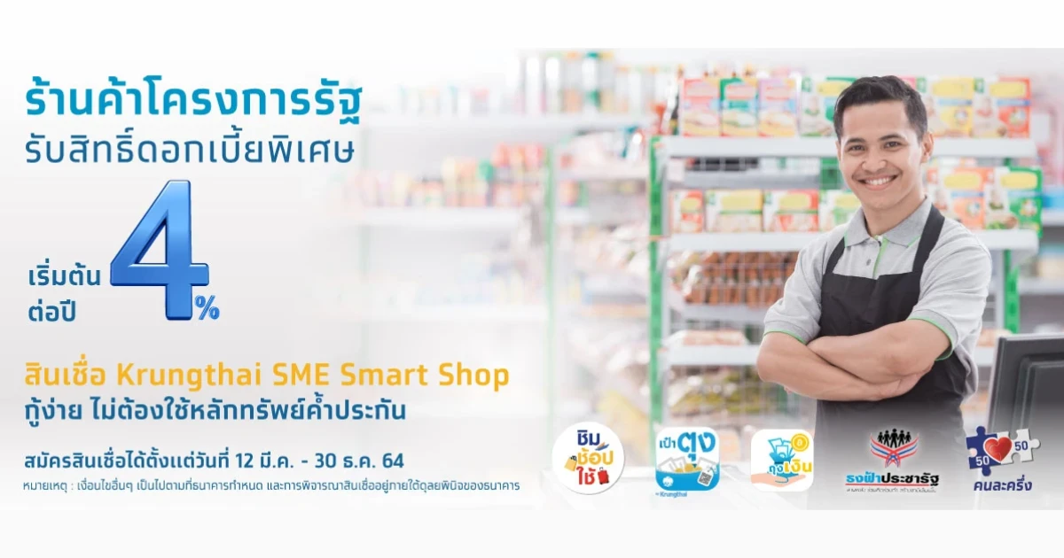 สินเชื่อ Krungthai SME Smart Shop กู้ง่าย ไม่ต้องใช้หลักทรัพย์ค้ำประกัน ดอกเบี้ยพิเศษเริ่มต้น 4% ต่อปี