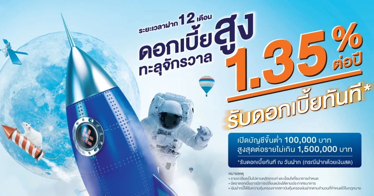 โปรโมชั่นเงินฝากประจำ 12 เดือน ดอกเบี้ยสูงทะลุจักรวาล 1.35% ต่อปี จาก ธ.ไทยเครดิต