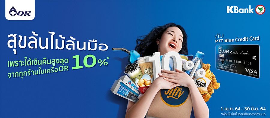 หมายเหตุ : *เครดิตเงินคืนสูงสุด 10% คำนวณจากเครดิตเงินคืนต่อที่ 1 สูงสุด 6% รวมกับเครดิตเงินคืนต่อที่ 2 อีก 4% เมื่อใช้จ่ายผ่านบัตร PTT BLUE CREDIT CARD ที่ร้านค้าในเครือโออาร์ครบตามที่กำหนด