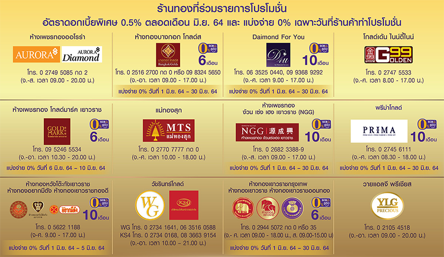 - สิทธิพิเศษนี้สำหรับผู้ถือบัตรเครดิตธนาคารไทยพาณิชย์ทุกประเภท ("ผู้ถือบัตร") เมื่อซื้อทองรูปพรรณ หรือเครื่องประดับเพชร พร้อมแบ่งจ่าย 0% ในวันที่ร้านค้าจัดโปรโมชันแบ่งจ่าย 0% และ 0.5% นานสูงสุด 10 เดือน ดอกเบี้ยพิเศษสำหรับลูกค้า ที่ห้างเพชรทองออโรร่า, ห้างทองบางกอก โกลด์ส, Diamond For You, โกลด์เด้น ไนน์ตี้ไนน์, ห้างเพชรทอง โกลด์มาร์ค เยาวราช, ห้างทองแม่ทองสุก, ห้างเพชรทองง้วนเซ่งเฮงเยาวราช (NGG), บริษัท พรีม่าโกลด์ อินเตอร์เนชั่นแนล จำกัด, ห้างทองหวังโต๊ะกังเยาวราช ห้างทองอยากมีตัง ห้างทองเยาวราชทองดี, ร้านวัชรินทร์โกลด์, ห้างทองเยาวราชกรุงเทพ ห้างทองเยาวราช ห้างทองเยาวราชออมทอง ที่ร่วมรายการ, บริษัท วายแอลจี พรีเชียส จำกัด ระหว่างวันที่ 1 มิ.ย. 64 - 30 มิ.ย. 64