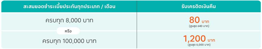 - รับเครดิตเงินคืนจากการชำระเบี้ยประกันทุกประเภท สูงสุด 6,000 บาท / บัญชีบัตรหลัก / เดือน (เท่ากับยอดใช้จ่ายสะสม 500,000 บาท / เดือน) และไม่เกิน 24,000 บาท / บัญชีบัตรหลัก ตลอดรายการ
