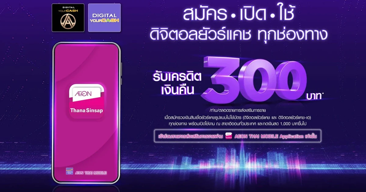 - เมื่อทำการสมัครสินเชื่อดิจิตอลยัวร์แคชและสินเชื่อดิจิตอลยัวร์แคชเอ ระหว่างวันที่ 16 มิถุนายน 2564 - 31 กรกฎาคม 2564 และเปิดใช้บริการสินเชื่อดิจิตอลยัวร์แคชบนแอปพลิเคชัน AEON THAI MOBILE ที่สาขาอิออน และมียอดกดเงินตั้งแต่ 1,000 บาทขึ้นไป ระหว่างวันที่ 16 มิถุนายน 2564 - 31 สิงหาคม 2564 รับเครดิตเงินคืน 300 บาท