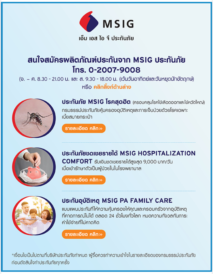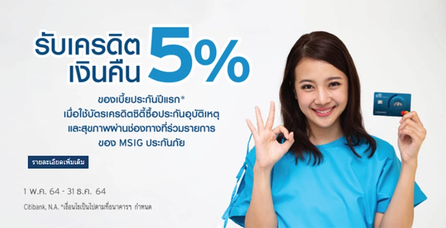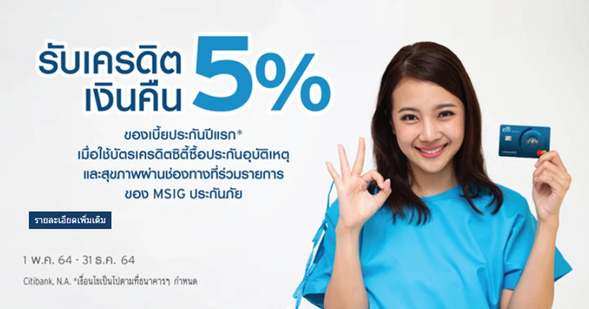 รับเครดิตเงินคืน 5% ของเบี้ยประกันปีแรก เมื่อใช้บัตรเครดิตซิตี้ซื้อประกันอุบัติเหตุ และสุขภาพผ่านช่องทางที่ร่วมรายการของ MSIG ประกันภัย