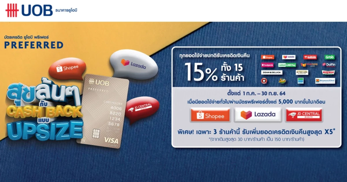 สิทธิพิเศษสำหรับผู้ถือบัตรเครดิตยูโอบี พรีเฟอร์ รับเพิ่ม ยอดเครดิตเงินคืน X5* สำหรับยอดใช้จ่ายที่ Shopee, Lazada และ JD เมื่อมียอดใช้จ่ายอื่นๆ สะสมต่อเดือนผ่านบัตรฯ ตั้งแต่ 5,000 บาท ขึ้นไป (*จากเดิมสูงสุด 30 บาท/ร้านค้า เป็น 150 บาท/ร้านค้า)