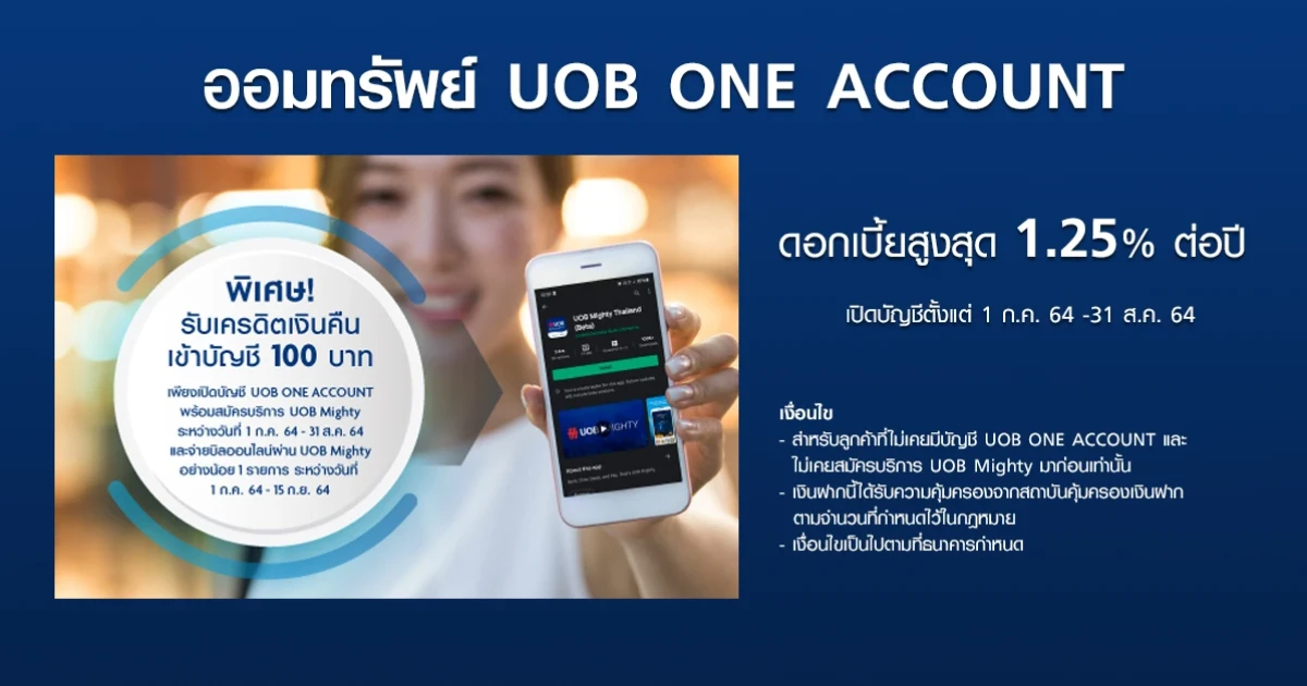 โปรโมชั่นพิเศษ...รับเครดิตเงินคืนเข้าบัญชี UOB ONE Account 100 บาท สำหรับลูกค้าที่เปิด บัญชีเงินฝากออมทรัพย์ UOB ONE ACCOUNT พร้อมสมัครใช้บริการ UOB Mighty ระหว่างวันที่ 1 ก.ค. 64 - 31 ส.ค. 64 และจ่ายบิลออนไลน์ผ่าน UOB Mighty อย่างน้อย 1 รายการ ระหว่างวันที่ 1 ก.ค. 64 - 15 ก.ย. 64
