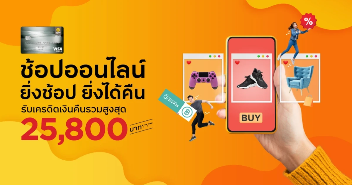 - *สงวนสิทธิ์การให้เครดิตเงินคืนสูงสุด 1,200 บาท/บัญชีบัตรหลัก/เดือน และสูงสุด 4,800 บาท/บัญชีบัตรหลัก/ตลอดรายการ โดยยอดเครดิตเงินคืนจะคำนวณรวมจากแอปพลิเคชัน/ร้านค้าช้อปปิ้งออนไลน์ที่ร่วมรายการ (คำนวณยอดใช้จ่ายจากทั้งบัตรหลักและบัตรเสริมรวมกัน)