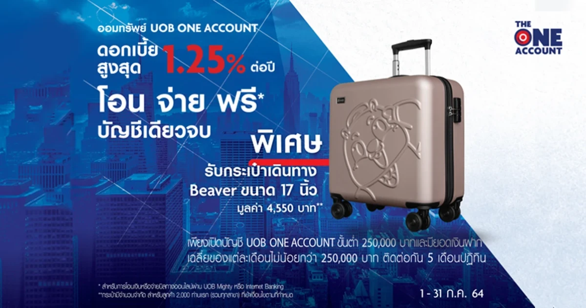 เปิดบัญชี UOB ONE ACCOUNT วันนี้ และมีเงินฝากตามเงื่อนไข รับกระเป๋าเดินทาง Beaver ขนาด 17 นิ้ว มูลค่า 4,550 บาท**