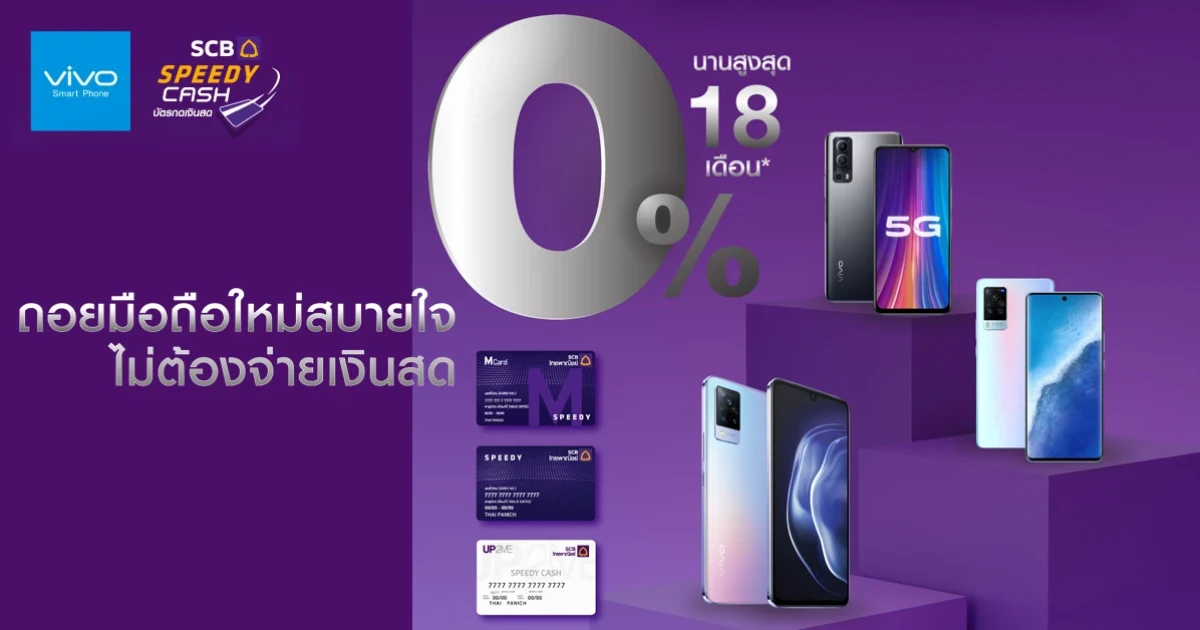 - สิทธิพิเศษสำหรับผู้ถือบัตร Speedy Cash ทุกประเภท ยกเว้นบัตร Speedy Cash Plus และ Speedy Cash Prompt ที่มีหมายเลขบัตร 777777xx xxxxxxxx ("ผู้ถือบัตร") เมื่อชำระผ่านบัตร Speedy Cash ภายในร้าน VIVO Shop รับสิทธิ์ผ่อนชำระดอกเบี้ย 0% เฉพาะสินค้าที่ร่วมรายการ เมื่อมียอดแบ่งจ่ายผ่านบัตร Speedy Cash โดยเมื่อมี