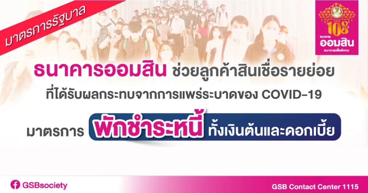 ธนาคารออมสิน...ช่วยลูกค้าสินเชื่อรายย่อยที่ได้รับผลกระทบจากการแพร่ระบาดของ COVID-19 มาตรการ "พักชำระหนี้" ทั้งเงินต้นและดอกเบี้ย