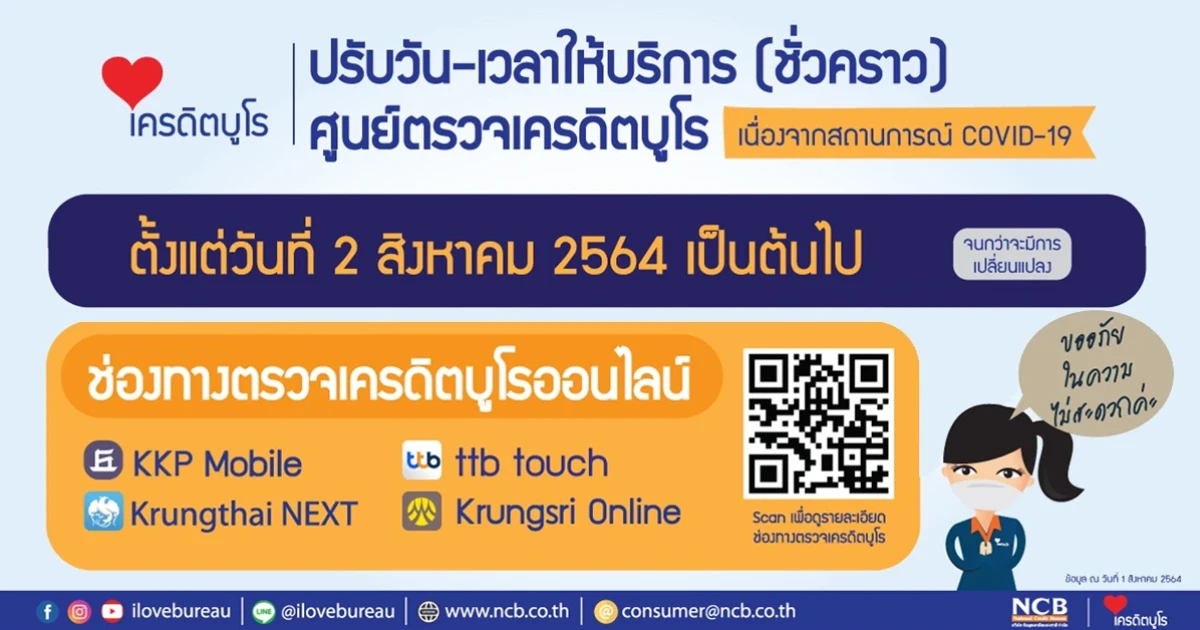 ปรับวัน - เวลาให้บริการตรวจเครดิตบูโร และเครดิตสกอริ่ง (ชั่วคราว) ตั้งแต่วันที่ 2 สิงหาคม 2564 เป็นต้นไป