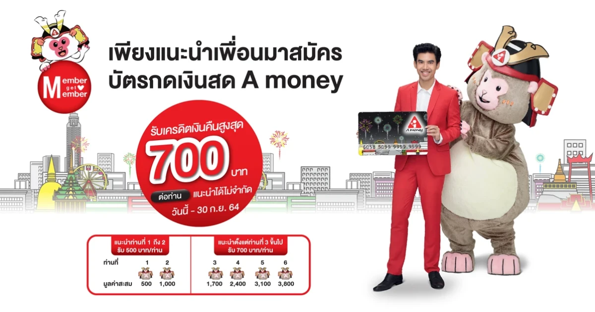 เพียงแนะนำเพื่อนมาสมัครบัตรกดเงินสด A money และได้รับอนุมัติ รับเครดิตเงินคืนสูงสุด 700 บาท/ท่าน แนะนำได้ไม่จำกัด วันนี้ - 30 กันยายน 2564