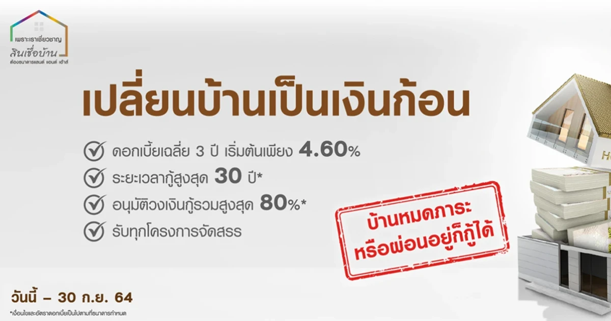 เปลี่ยนบ้านเป็นเงินก้อน ดอกเบี้ยเฉลี่ย 3 ปี เริ่มต้นเพียง 4.60% ต่อปี บ้านหมดภาระหรือผ่อนอยู่ก็กู้ได้