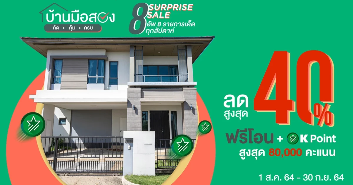 แคมเปญ 8 Surprise Sale บ้านมือสอง ลดสูงสุด 40% ฟรีโอนสูงสุด 80,000 บาท จากกสิกรไทย