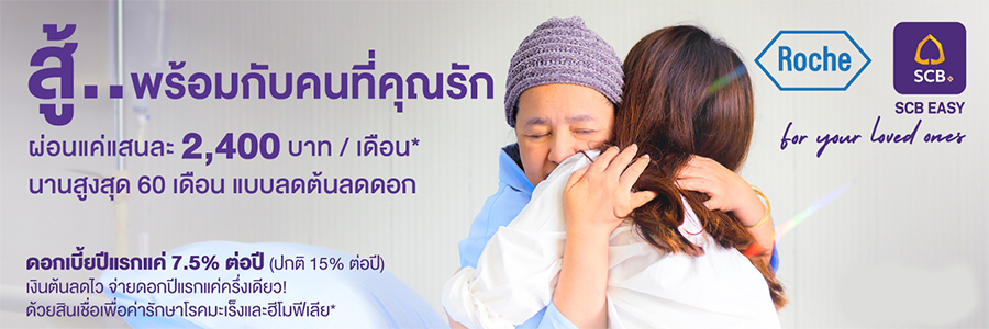 ให้โครงการสินเชื่อเพื่อค่ารักษาโรคมะเร็งและโรคฮีโมฟีเลีย ช่วยแบ่งเบาความกังวลเรื่องค่ารักษาโรคมะเร็งและโรคฮีโมฟีเลียของคนที่คุณรัก พิเศษ! จ่ายดอกเบี้ยแค่ครึ่งเดียวเพียง 7.5% ต่อปี นาน 12 เดือนแรก* ในอัตราลดต้นลดดอก เมื่อเข้าร่วมโครงการ Roche Patient Support Solution (RPSS) และมีเอกสารใบแจ้งค่ายารักษาตามโครงการต่อครั้ง ออกโดยเจ้าหน้าที่ของบริษัท อินดิเพนเดนท์ โพรเซสซิ่ง เซอร์วิสเซส จำกัด (IPS) ตามเงื่อนไขของโครงการ RPSS ณ โรงพยาบาลของรัฐบาลทุกแห่งทั่วประเทศ และโรงพยาบาลเอกชนที่เข้าร่วมโครงการ ซึ่งวงเงินสูงสุดในการสมัครขอสินเชื่อแต่ละครั้งจะไม่เกินค่ายารักษาโรคมะเร็ง หรือยารักษาโรคฮีโมฟีเลีย ต่อสองรอบการรักษาของผู้ป่วย ติดต่อสอบถามข้อมูลสินเชื่อเพิ่มเติมที่ SCB Call Center หรือรายละเอียดโครงการ RPSS กับเจ้าหน้าที่ของบริษัท อินดิเพนเดนท์ โพรเซสซิ่ง เซอร์วิสเซส จำกัด (IPS) โทร 02-161-4948