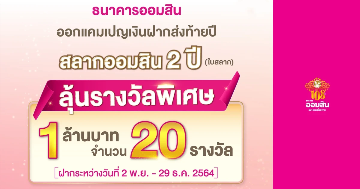 "ออมสิน" ใจป้ำจัดรางวัลพิเศษ 1 ล้านบาท 20 รางวัล ให้ผู้ฝากสลากออมสินช่วงส่งท้ายปีพร้อมออกเงินฝากเผื่อเรียกพิเศษ ดอกเบี้ยสูง และไม่หักภาษี
